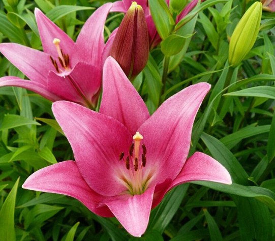 百合:花朵硕大,花姿优雅,气味芬芳,花色丰富。家庭可将百合种植在庭院的树荫下、房屋周围等处,也可盆栽布置室内。此外,百合花的花梗粗壮挺拔,花期长,也是重要的切花材料,常用于婚礼或其他礼仪场合。百合的鳞茎含有丰富的蛋白质、维生素、淀粉等营养物质,可供食用,是上等的滋补品。