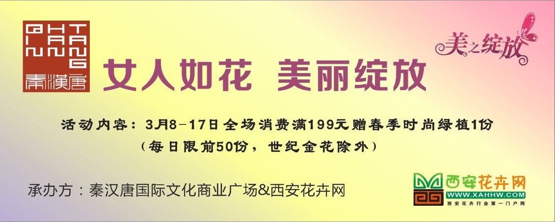 3月8日—17日,由西安花卉网和秦汉唐国际文化商业广场合作,举办以“女人如花,美丽绽放”为主题的大型活动。此活动是专门针对3月份的重要节日而展开的活动。