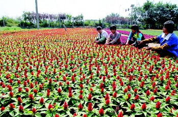 从工业北路一直向东,到历城区董家镇张而村口往北拐,大约行进一公里就能看到路西的济南世珍苗木花卉基地。该基地是济南乃至周边地区规模最大的园林生产基地。据基地负责人赵新坤介绍,基地1985年创办,最初只有100亩地,经过20多年的发展,已经发展到现在的千亩科技生产基地。每年仅向省城输出矮牵牛、一串红、蝴蝶兰、海棠、凤仙等布展草花(普通布展花卉与观赏植物的统称)就达600万盆,供应量占到整个济南市场份额的70%以上。换句话说,济南的大街上每10盆花中就有7盆是世珍“出品”的。基地栽植了10多万株楸树苗,是我国最大的楸树单一繁育基地;太阳花去年产量达150万盆,占济南市场份额的95%以上。“不少园林绿化工程招标虽然由不同的公司中标,但最后供货商往往还是我们。”赵新坤说,目前,基地几乎垄断了历城、天桥、历下和市中等园林绿化大户的供应,此外还承揽了泉城路全年的花卉布展,仅一个国庆节,泉城路就用掉13万盆草花。今年济南西站投入使用,基地就一次性输出了近200万盆草花。而且,基地培育的花草产品不仅发往济南市区,而且还源源不断地向聊城、泰安、莱芜、淄博、德州以及周边的河南、河北等地进行输送,每逢周末、节假日,不少单位、市民都纷纷慕名来到基地选购。赵新坤介绍,国庆用花一般都选择颜色艳丽一点、喜庆一点的,像矮牵牛、一串红、四季海棠、孔雀草、鸡冠花、万寿菊等很受欢迎。譬如矮牵牛,虽然长得比普通牵牛要小,但是花朵的颜色非常艳丽,色彩对比强烈,适合造型布展。而且,价格也不高,因此成为国庆草花最热销的一个品种。现如今,人们都非常注重环保,赵新坤还告诉记者,经过实验证明,常春藤是室内净化空气、消除甲醛异味的最好品种,金虎、吊兰也都不错。