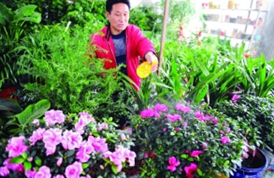 昨日上午,在市区花鸟市场花卉温棚里,沈先生正在护理花卉。虽然室外温度很低,但温棚里却温暖如春。