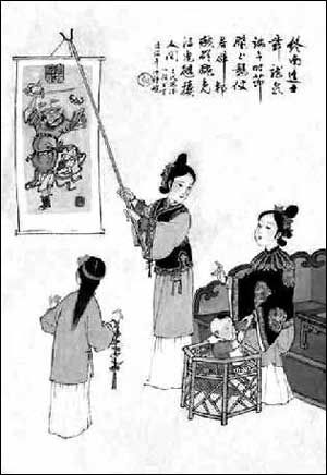 端午节期间,有些地方还流行居室中悬挂钟馗像的习俗,据清代《北平风俗类征》记载:“五月初一至初五为端阳节,午时以朱墨画钟馗像,用鸡血点眼,俗称‘朱砂判’者悬屋中,谓能驱邪。”顾禄曾在他的《清嘉录》中也有记述:“适逢端午,堂中挂钟馗画图一月,以祛邪魅。”钟馗乃唐朝有名画家吴道子笔下的人物。据宋代《醉翁谈录》云:“除夜,旧传唐明皇是夕梦鬼物,名曰钟馗,既觉,命工绘画之。至今人家图其形,贴于门壁。”相传,唐明皇李隆基一次久病不愈,偶有一夜,梦见一大鬼捉去一小鬼,大鬼声称自己名钟馗,试武举未中,誓为皇帝陛下除天下妖孽。唐明皇梦醒,即刻病好。于是,便命吴道子将梦中的钟馗捉鬼作成一幅画,挂于宫中以避邪和镇妖。