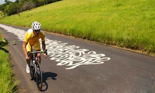 在2012伦敦奥运比赛期间,每个人都用自己的方式表达对奥运比赛的热爱。在本届奥运会的自行车公路赛上,可以看到绘制在赛道某一段上的奇特的涂鸦作品。事实上,这件由英国艺术家理查德·朗(Richard Long)创作的名为"Box Hill Road River" 的作品是一件永久艺术品,它是本届奥运会众多比赛项目的“景观遗产”之一。