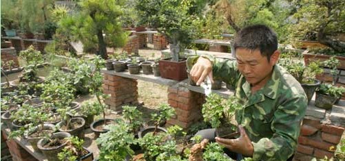 马超在精心修剪养护微型盆景菊花