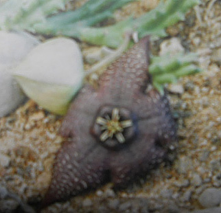 夜犀角(Stapelia berlindensis)原产于非洲热带地区,为萝?科国章属(豹皮花属)多肉植物,肉质茎柱状、绿色,边缘有齿,花大型,黑色花瓣稍向后翻卷,是多肉植物中的珍贵品种。