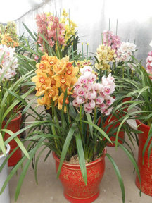 叶长碧绿、花姿壮丽的大花蕙兰,寓意丰盛祥和、福泰安康。寒冷冬季,家中摆上盛开的大花蕙兰,豪华大气、生机盎然,很能衬托节日的欢乐气氛。品种有红色、粉色、绿色、黄色和橙色等。