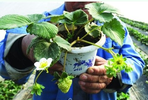 眼下正是地产草莓批量上市的时候,苏州吴江同里澄湖蔬菜园艺专业合作社新推出的20元一盆的盆栽草莓很受市场青睐。它既能用于绿化盆景,又能食用,一举两得。