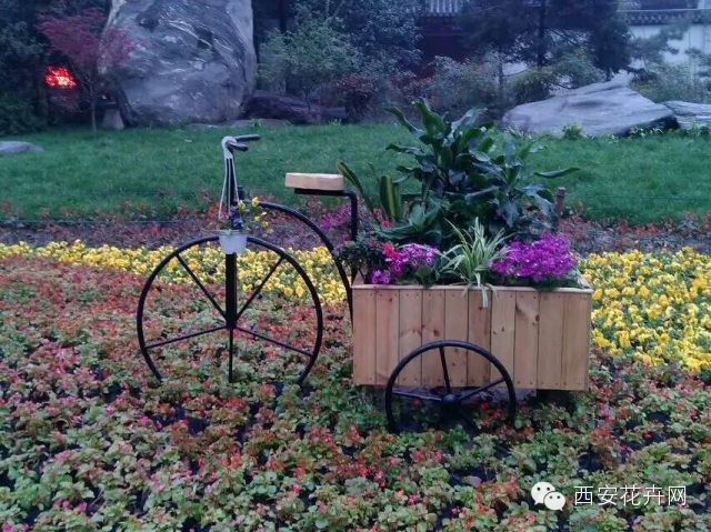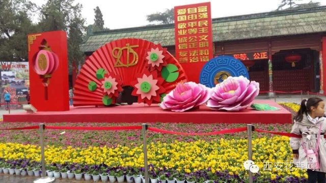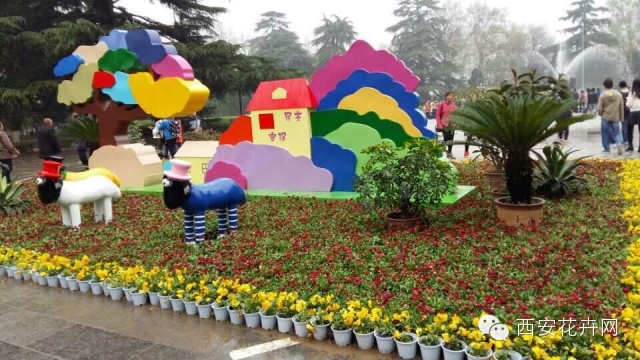 在公园东门、南门和西门区域摆放三色堇、矮牵牛、金盏菊、角堇等草花10万余盆;在南门外广场展出国色天香造型一组,西门内广场展出喜气洋洋造型一组,同时展区内通过乡村小屋、卡通羊、红泥花罐、铁艺花车、防腐木花车、水井花钵、花架、荷兰奶牛、荷兰少女、花扇、宫灯、蝴蝶、红五星等多种特色造型,展现浪漫的异国风情和浓厚的中国传统文化。
