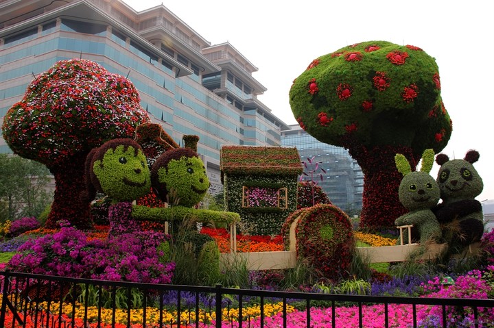 据悉,为了喜迎国庆,市园林局对国庆期间西安主要干道的鲜花摆放工作进行了详细的安排。目前,摆花工作已全部结束,在公园、广场、主要街道及单位、小区门前共计摆放鲜花20万余盆,花卉主要采用孔雀草、万寿菊、银叶菊、金盏菊、三色堇等多个品种。本次摆花以“红”、“黄”两色为主色调,造型设计上主要以平面花坛为主,物摆放的 “国庆”、“祖国万岁”、“中华崛起”等文字图案格外醒目,烘托出浓郁的节日气氛, 下面我们来欣赏造型各异的立体花坛: