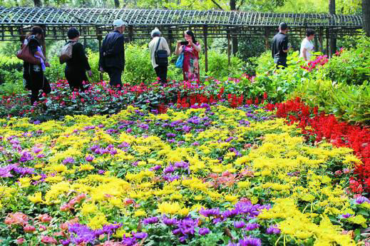 10月21日是重阳节,苏州古典园林拙政园内举办的“金秋菊花展”上,近万盆菊花争奇斗艳,吸引众多游客和市民前往观赏。据了解,在江南一带登高赏菊吃糕是重阳节的三大传统习俗。图为游客在拙政园赏菊拍照。