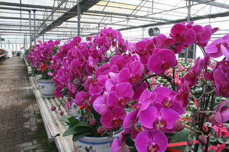 推开花卉之家的大门,记者看到,整个大棚的地上被各种花卉和绿色植物铺满,花架上也摆满了各种叫不上名的绿色植物,湿润的空气扑面而来,杜鹃花、蝴蝶兰竞相绽放,技术人员正忙着给花卉造型、装盆。