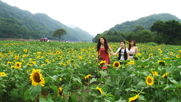 7月4日,游人在烟台福山区一处葵花园欣赏葵花。当前,葵花进入盛花期,在蓝天白云下,一片片向日葵花竞相绽放,金黄艳丽的朵朵葵花像一张张笑脸迎风摇曳,构成一幅独具特色的田园风光画,吸引大批游客纷至沓来。