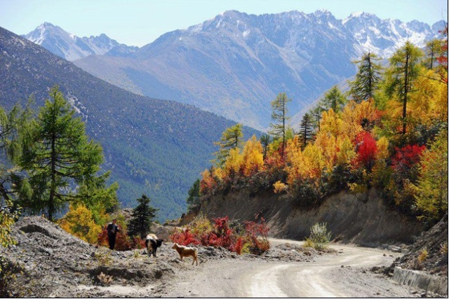米兰罗的红叶由高到低,层次分明地从山顶红到河谷,满山红叶竞相争艳。