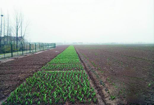 江苏大丰荷兰花海郁金香技术示范场景,已绿意盎然的为示范田,旁边为对照田。