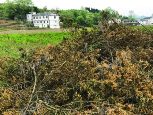 记者沿着乡村小路,走向村后的另一个寨子。沿途山坡、平坝里的地头,能看见零星的玫瑰花在绽放,同时也能看到被砍倒、连根挖出后枯死的月季堆在地里。有的地里,被砍掉地面部分的玫瑰又发出了新苗,旁边是成排种植的玉米苗。