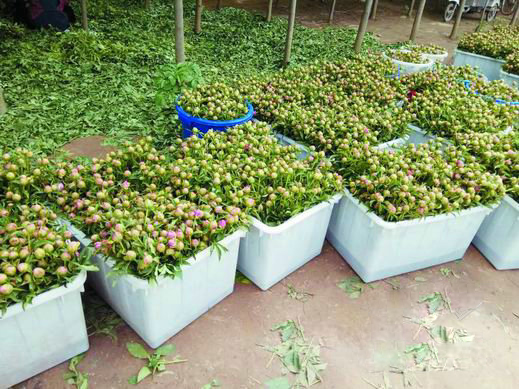 成立于2015年的菏泽市牡丹区宏德牡丹销售有限公司,目前除种植‘冠群芳’、‘百园红霞’、‘雪映桃花’等牡丹品种200多亩外,还种植‘大富贵’、‘紫凤朝阳’、‘种生粉’等10多个芍药品种,去年采收芍药切花约100万枝。公司董事长王建胜告诉记者,他们通过早花、中花和晚花品种的合理搭配,使得今年的芍药切花采花期持续到5月20日左右。今年自“五·一”节以来,每天上市芍药切花约10万枝,目前采收上市的品种主要是‘蓝富士’。“今年的芍药切花根据品种、花色和枝长的不同,每枝批发价在1.1元至1.8元之间。”王建胜说。