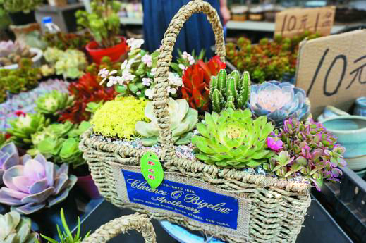 多肉组盆已不稀奇,提篮多肉最近成新宠。近日,笔者在昆明斗南花市看到用提篮作为盆器的多肉盆栽在市场热销。据市场商户介绍,提篮有铁艺、木制、藤编和草编的,底部放一层防漏基质膜,选取不同意境和风格的多肉与之搭配,单品零售价在80元左右,很多人作为花礼使用,同时提篮携带方便,深受消费者欢迎。