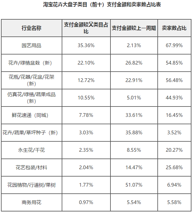 从卖家参谋近30天(5月14日至6月13日)数据来看,大盘访客数较上一周期下滑21.44%,相应支付件数减少19.30%,花卉/绿植盆栽产品支付金额下滑最多,花园植物/行道树/果树支付金额较上一周期降幅最大。