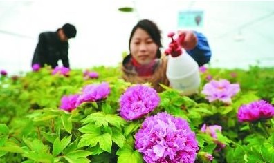 “牡丹花冬天开放,选苗很重要,一般2-3年的苗是不可能开花的,要选择那些6-7年的苗,而且苗的质量一定要好,要适合进行催花,牡丹有9大色系,上千个品种,不是所有的苗都适合在冬天开放的。”工作人员告诉记者,选好苗之后,要先把苗放在冷库里休眠40多天,然后放在温室里催花,进行加温,历时要将近两个月,“然后就是栽培,牡丹花很宝贵,对生长环境的要求很高,土壤要五六种机质混合在一起,水分、温度、湿度、通风、光线等要求都很高。”