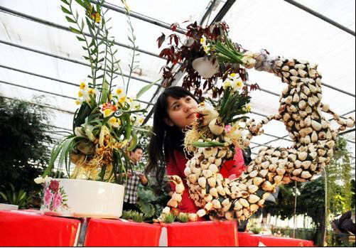 今年的作品大多造型新颖奇特并富有浓厚的艺术色彩。如:双龙送福、滴水观音、大龙虾、喜上眉梢、凤舞九天等水仙雕刻作品都是首次亮相。特别是由昌平职业学校选送,高级教师、花卉专家吴亚芹的水仙雕刻作品“龙凤呈祥”很是抢眼,该作品长1.2米,高0.8米,由580个水仙子鳞茎做成龙身的鳞片,就连龙嘴里含的龙珠都是水仙子鳞茎所做,龙头、龙身、龙尾巴、龙珠全部用水仙子鳞茎拼成,与高0.6米两头水仙拼成的凤遥相呼应,神态栩栩如生,活灵活现。