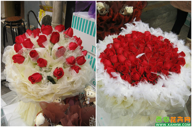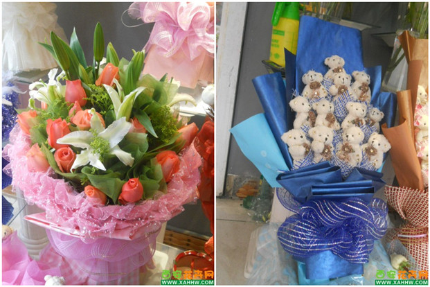 从市场南门口进去,在右手方向,第一家是个鲜花店—美度园艺。推门进去,只见工作人员各自忙碌,有在组花的,准备送花的,打电话谈生意的……老板很热情的示意我们:随便看!小编大概打量了一番,组好的花束有九十九朵玫瑰、公仔、玫瑰和百合。五颜六色,很是漂亮。