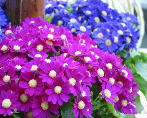 瓜叶菊多年生草本,常作1-2年生栽培。分为高生种和矮生种,20-90厘米不等。全株被微毛,叶片大形如瓜叶,绿色光亮。花顶生,头状花序多数聚合成伞房花序,花序密集覆盖于枝顶,常呈一锅底形,花色丰富,除黄色以外其他颜色均有,还有红白相间的复色,花期1-4月。