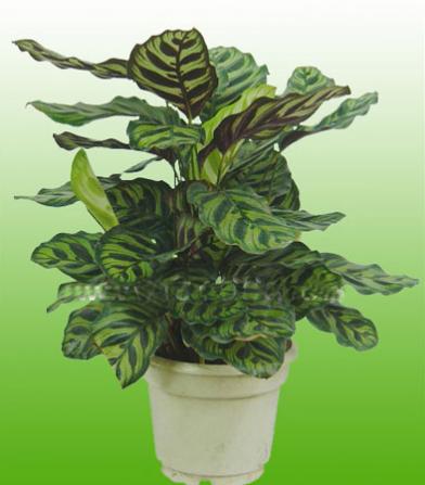 孔雀竹芋多年生常绿草本。高30~60厘米,叶长15~20厘米,宽5~10厘米,卵状椭圆形,叶薄,革质,叶柄紫红色。绿色叶面上隐约呈现金属光泽,且明亮艳丽,沿中脉两侧分布着羽状、暗绿色、长椭圆形的绒状斑块,左右交互排列。叶背紫红色。本种叶为银绿色,并从中脉放射出深绿色斑点,背面有同样形状的褐红色斑窍。孔雀竹芋除甲醛的功效值为吊兰的一半,但相比普通植物也要高很多,此外,它还是清除空气中的氨气污染的高手(其在10平方米内可清除甲醛0.86mg,氨气2.19mg)。
