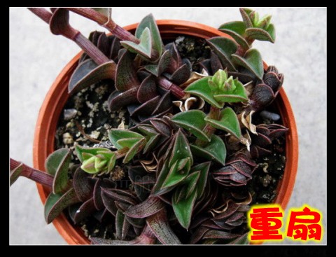 原产于秘鲁北部,生长形态及特点:重扇为多年生肉质草本,茎匍匐或平卧,分节,触地节间即生根。叶三角状船形,上下叶常重迭,正面灰绿色背面略呈紫色,1—2厘米长,密被细毛,叶缘有睫毛状纤毛。假伞房花序,花玫瑰红色。