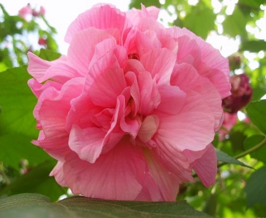芙蓉原是荷花的别称,生于水中的是为草芙蓉,生于陆地的是为木芙蓉。木芙蓉八九月开花,花冠白色或淡红色与荷花平分秋色。在《红楼梦》中所写的“芙蓉”均是指木芙蓉。《广群芳谱》中称此花清姿雅质,独殿众芳。秋江寂寞,不怨东风,可称俟命之君子矣。