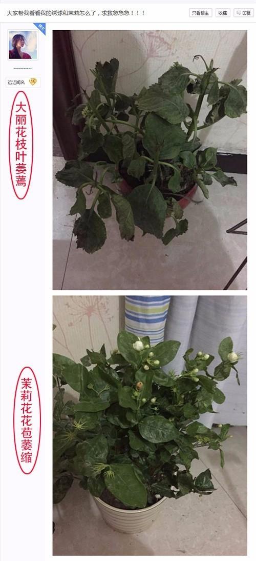 这位花友的绣球和茉莉,买的时候没有任何问题,买回来两天后就都变得萎蔫没有精神了。
