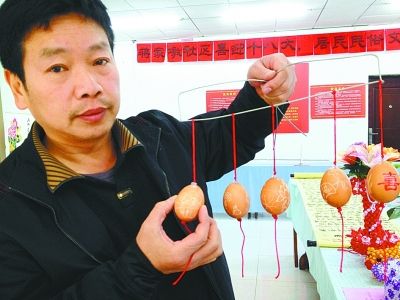雕刻完,他在鸡蛋上下各刻一个小孔,用牙签搅开蛋清蛋黄并倒出,注水洗净。他用从夜市买来的红绳和平时收集的塑料珠,把鸡蛋串起来,一只具有浓浓中国风的雕花鸡蛋就做成了。