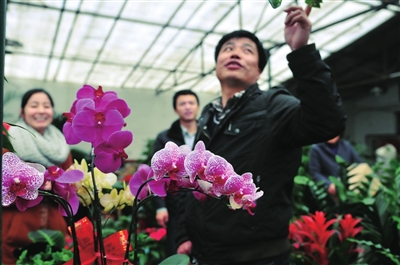 市民正在金凤区荣锦苑花鸟鱼市场内选购鲜花。我市气温逐渐降低,但是,各个花卉市场的花卉销售大棚里却是一片红火的景象,平安树、蝴蝶兰等花卉受到市民的欢迎,据市场卖家介绍,冬季花卉销售量大幅增加,售价因运费原因比夏季平均每盆高10元左右。