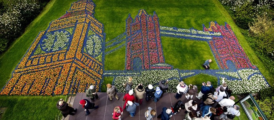 荷兰利瑟,库肯霍夫郁金香公园举办英国主题花园展,由花卉组成的大本钟和塔桥亮相。此花园展引起了来自各国游客前来观光。不少游客纷纷表示,大本钟和塔桥的创意独特,很有立体感。