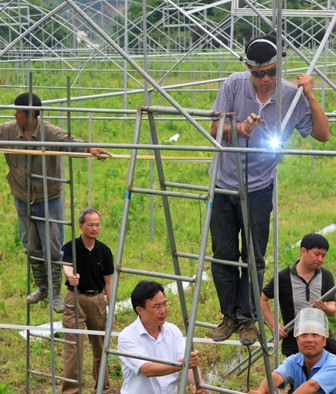 昨日,在章贡区水西镇蛤湖村,章贡区法院“送政策、送温暖、送服务”干部协助村民搭建花卉大棚。近期,“三送”干部积极帮助当地村民引进大型农业产业项目,规划建设200亩玫瑰花等花卉种植基地。